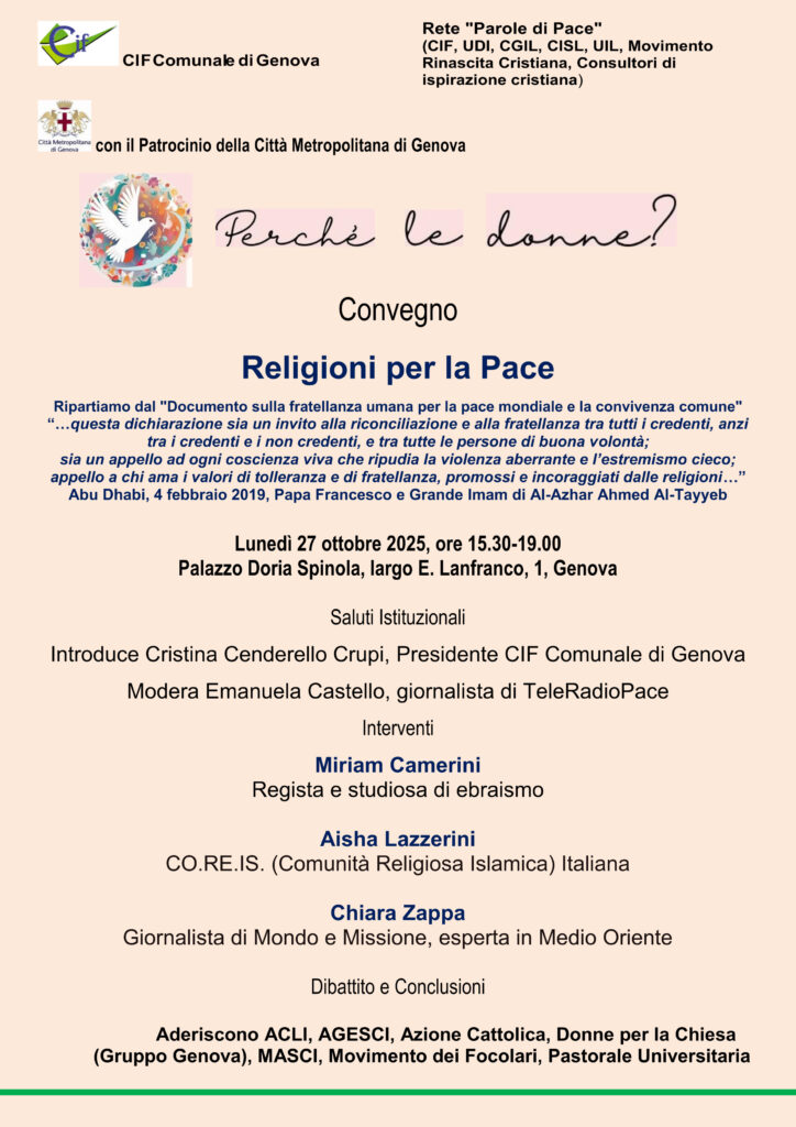 Lunedì 27 ottobre dalle ore 15.30 a Palazzo Doria Spinola (Largo Lanfranco, 1) è in programma il convegno “Perchè le donne? Religioni per la pace”, organizzato dalla Rete “Parole di pace”, composto da Cif, UDI, CGIL, Cisl, UIL, Movimento Rinascita Cristiana, Consultori di Ispirazione Cristiana).