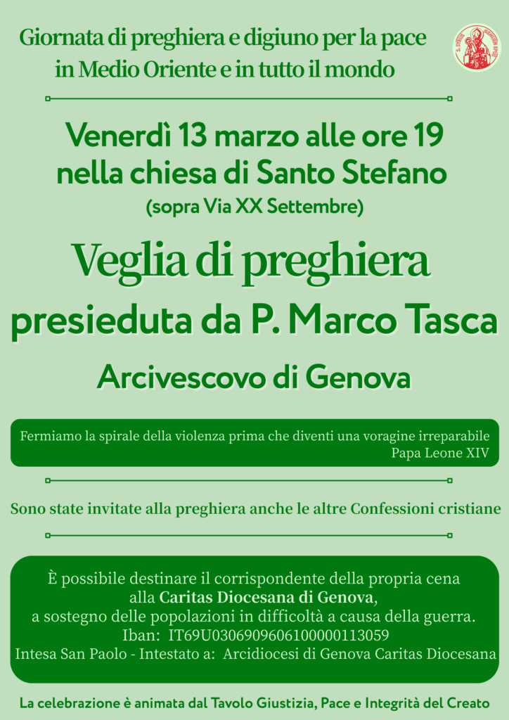 Per questa occasione, chi parteciperà alla Veglia e tutti coloro che lo desiderano sono invitati a destinare il corrispondente della propria cena alla Caritas Diocesana, affinché i proventi siano rivolti alle popolazioni in difficoltà a causa della guerra in Medio Oriente (Iban: IT69U0306909606100000113059 – Banca Intesa San Paolo – Intestato a: Arcidiocesi di Genova – Caritas Diocesana).