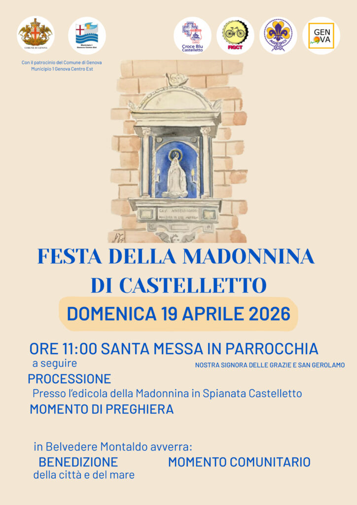 Domenica 19 aprile si svolge la Festa della Madonnina di Castelletto. L’evento gode del patrocinio del Comune di Genova – Municipio 1 Centro Est. La giornata sarà un importante momento di fede e aggregazione per il quartiere e l’intera città, e coinvolgerà diverse realtà locali come la Croce Blu Castelletto, l’AGESCI e la FIGCT.