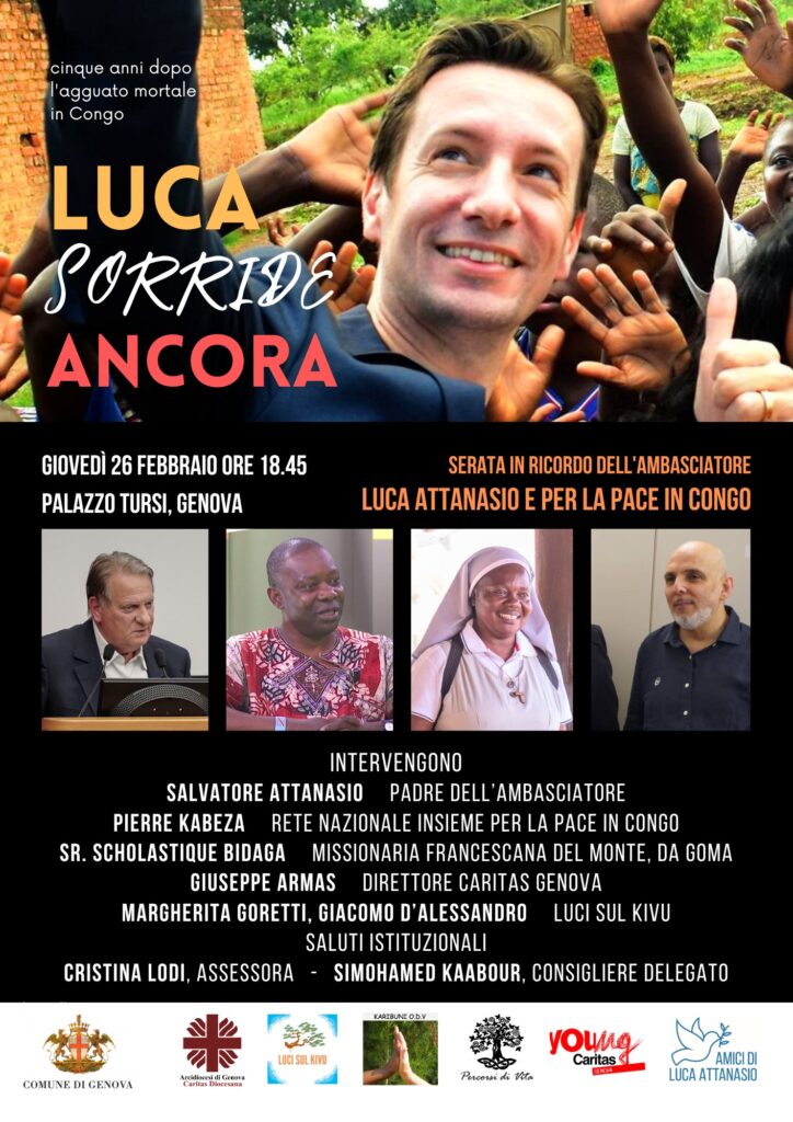 All’incontro parteciperà Salvatore Attanasio, padre del diplomatico, la cui testimonianza rappresenterà uno dei momenti centrali della serata. Sono previsti gli interventi di Pierre Kabeza, della Rete nazionale “Insieme per la pace in Congo”, di suor Scholastique Bidaga, missionaria delle genovesi Suore Francescane del Monte, e di Giuseppe Armas, direttore della Caritas Genova. Porteranno inoltre il loro contributo Margherita Goretti e Giacomo D’Alessandro, volontari di “Luci sul Kivu”.