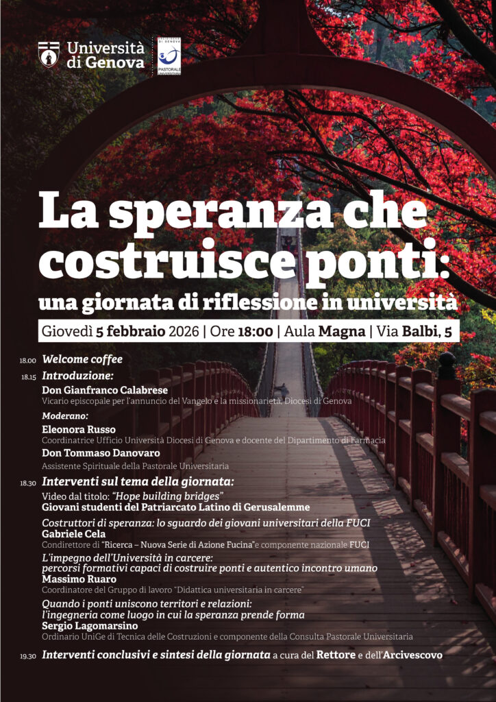 L’evento, che si svolgerà nell’Aula Magna di Via Balbi 5 dalle ore 18, è realizzato grazie alla sinergia fra Ufficio Università della Diocesi e l’Ateneo genovese, .