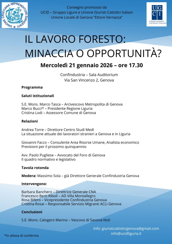 “Il lavoro foresto”, mercoledì 21 gennaio convegno Ucid e Giuristi cattolici