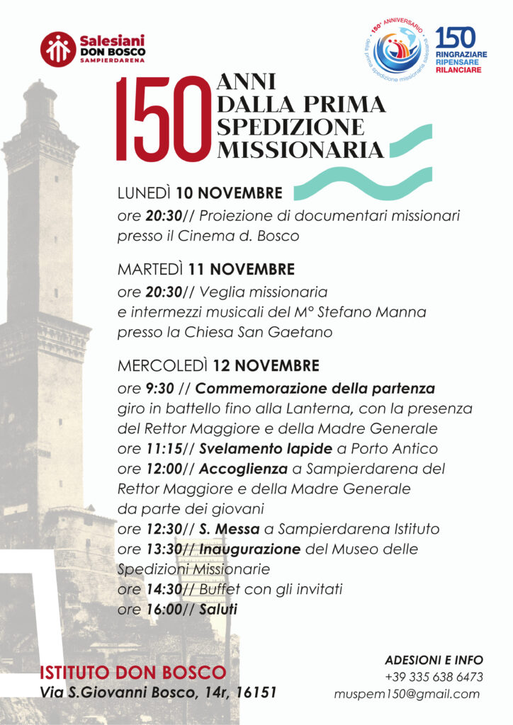 Il programma della commemorazione prevede: lunedì 10 novembre, alle ore 20.30, la proiezione di alcuni documentari missionari presso il Cinema Don Bosco-Club Amici del Cinema di Genova Sampierdarena; martedì 11 novembre, alle ore 20.30, la veglia missionaria di preghiera con intermezzi musicali del maestro Stefano Manna presso la Chiesa Don Bosco-San Gaetano di Genova Sampierdarena; mercoledì 12 novembre, alle 9.30, al Porto Antico l’arrivo dei missionari, alle 10 il percorso in battello fino alla Lanterna, con la presenza del Rettor Maggiore, Fabio Attard e la Madre Generale, Chiara Cazzuola, alle 11.15 lo svelamento di una lapide commemorativa al Porto Antico, alle 12.00 l’accoglienza al Don Bosco di Genova Sampierdarena da parte dei giovani, alle 12.30 la Santa messa in Parrocchia, e a seguire l’inaugurazione del Museo delle Spedizioni Missionarie.