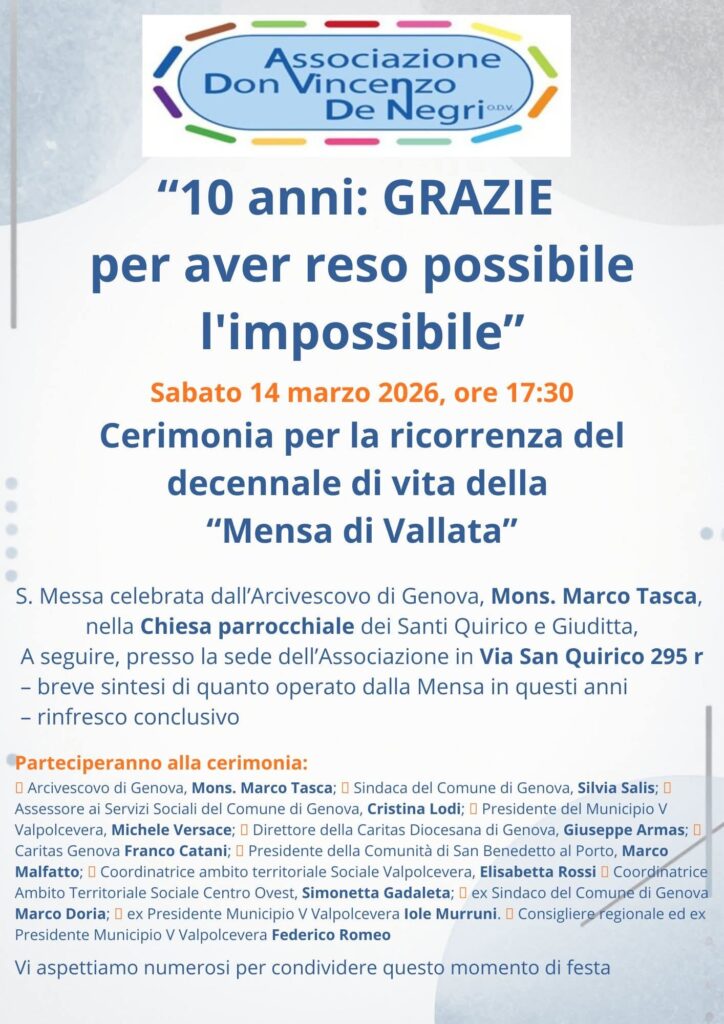Sabato 14 marzo alle ore 17.30 l’Associazione Don Vincenzo De Negri festeggia 10 anni della Mensa di Vallata a San Quirico in Val Polcevera, un decennio di preparazione e distribuzione di oltre 100.000 pasti, di condivisione con le persone più fragili, di relazione fraterna e aiuto pratico, di presenza sul territorio e nella comunità.