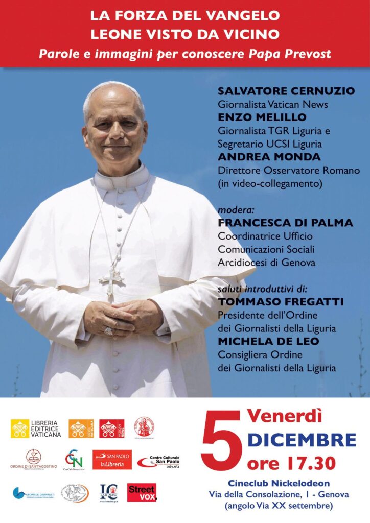 Venerdì 5 dicembre alle ore 17.30 al Cineclub Nickelodeon (via della Consolazione) la Libreria San Paolo, l’Ufficio Comunicazioni Sociali della Diocesi e l’Unione Cattolica Stampa Italiana della Liguria promuovono, in sinergia con il Dicastero per la Comunicazione della Santa Sede, Radio Vaticana – Vatican News e Libreria Editrice Vaticana, una serata su Papa Leone XIV in occasione dei suoi primi sei mesi di pontificato.