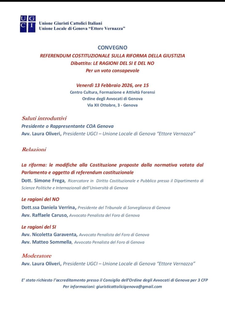 In vista del Referendum Costituzionale l’Unione Giuristi Cattolici Italiani (UGCI) – Unione locale di Genova Ettore Vernazza, organizza venerdì 13 febbraio ore 15 presso il Centro Cultura, Formazione e Attività Forensi dell’Ordine degli Avvocati di Genova (Via XII Ottobre, 3) un convegno dal titolo “Referendum Costituzionale sulla Riforma della Giustizia – Dibattito: le ragioni del Sì e del No. Per un voto consapevole”.