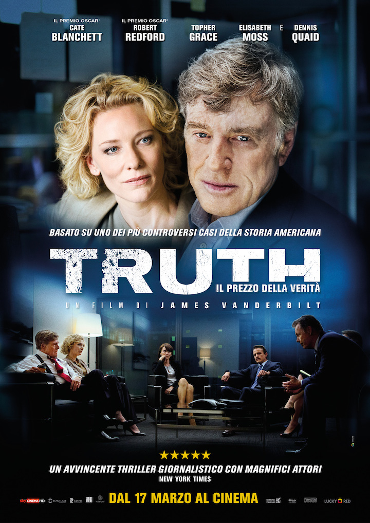 Truth, il prezzo della verità Regia di James Vanderbilt. Interpreti principali: Robert Redford, Cate Blanchett, Elisabeth Moss, Topher Grace, Dennis Quaid.