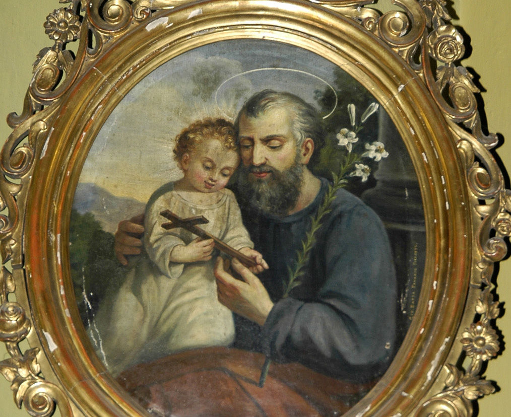 Il dipinto fa parte di un tronetto ligneo e rappresenta San Giuseppe che tiene tra le braccia Gesù Bambino. San Giuseppe con il braccio destro tiene la “verga fiorita” suo attributo iconografico, mentre con la mano tiene insieme al Bambino una croce; entrambi la osservano. La croce simbolo della sofferenza e del martirio che Gesù dovrà patire.