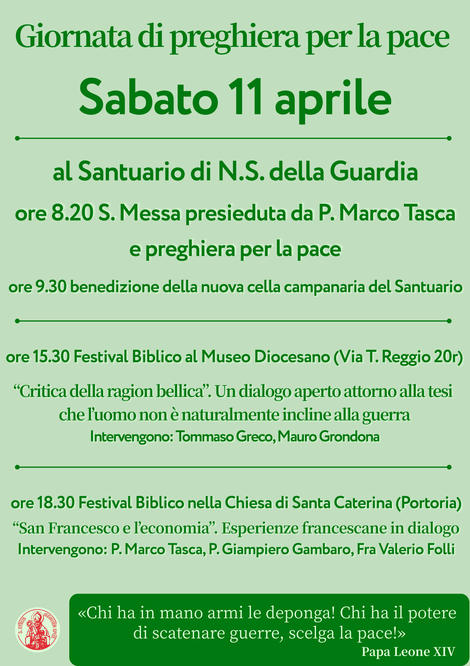 «La nostra Diocesi accoglie con prontezza l’invito di Papa Leone a radunarci per pregare insieme per la pace», spiega don Gianfranco Calabrese, Vicario Episcopale per l’Annuncio del Vangelo. «Al mattino ci ritroveremo al Santuario della Guardia dove, in concomitanza con l’inaugurazione della cella campanaria, faremo letteralmente “suonare la pace”, riuniti in una corale preghiera per chiedere la fine di tutte le guerre nel mondo. Al pomeriggio, nell’ambito degli incontri del Festival Biblico genovese, avremo due momenti molto significativi per riflettere sui temi della pace. Come spesso diciamo, ciascuno di noi può fare la sua parte, adottando stili e comportamenti di pace e di dialogo». Tutte le parrocchie e le associazioni della Diocesi sono state invitate a organizzare, nelle comunità locali, momenti di preghiera e riflessione sulla pace.