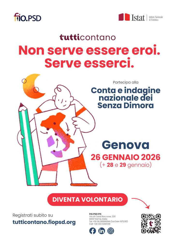 Il 26, 28 e 29 gennaio saranno giorni particolarmente significativi per la consapevolezza e le politiche sociali rispetto alla povertà estrema in Italia: in 13 città metropolitane italiane oltre a Genova (Bari, Bologna, Cagliari, Catania, Firenze, Messina, Milano, Napoli, Palermo, Reggio Calabria, Roma, Torino, Venezia), si svolgerà la Rilevazione sulle Persone Senza Dimora, un progetto inserito nel Censimento ISTAT e coordinato da fio.PDS, la Federazione Italiana Organismi Persone Senza Dimora.