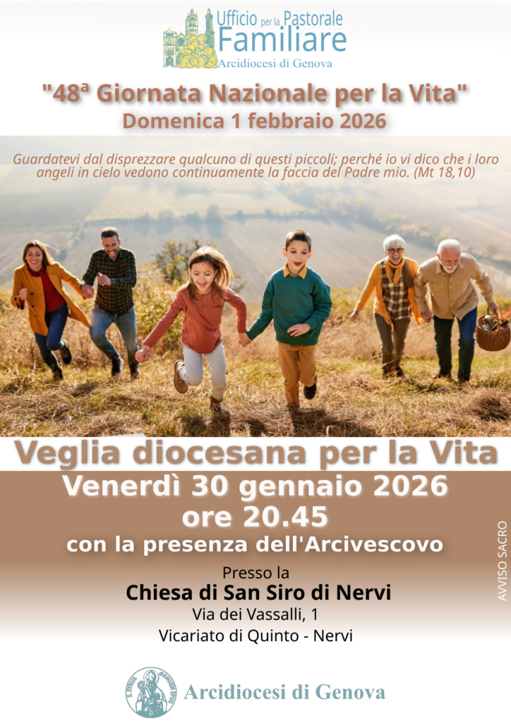 Venerdì 30 gennaio alle ore 20.45 nella chiesa di San Siro di Nervi è in programma, a cura dell’Ufficio per la Pastorale Familiare, la Veglia di preghiera per la Vita, in preparazione alla Giornata Nazionale di domenica 1 febbraio.